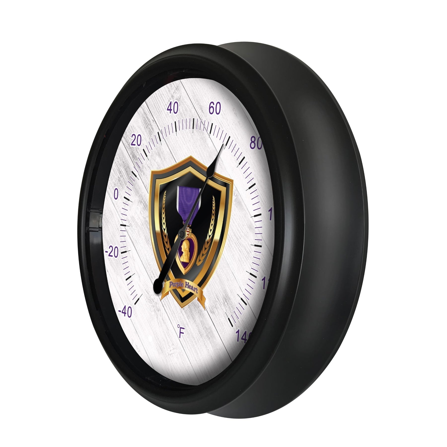 The dynamic Purple Heart Indoor/Outdoor LED Thermometer showcases vibrant, full-color UV printed artwork that is both eye-catching and durable. Factory calibrated to provide precise temperature readings from -40 degrees Fahrenheit to 140 degrees Fahrenheit, it's a reliable weather gauge for any setting. Show your patriotic pride with this functional and decorative thermometer!